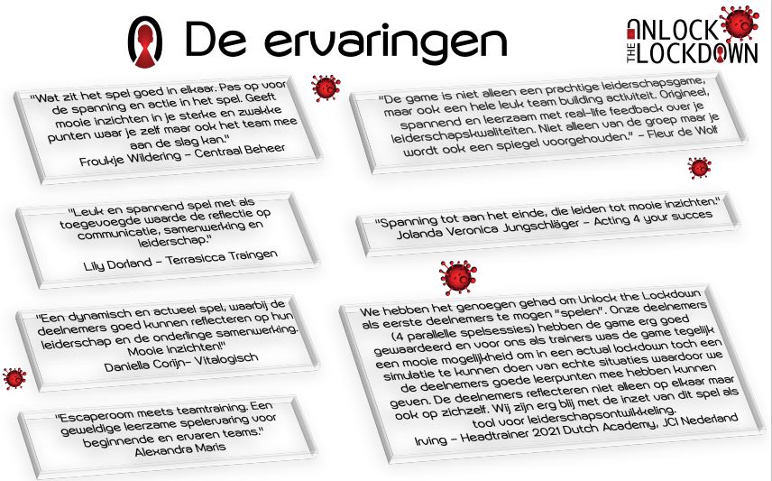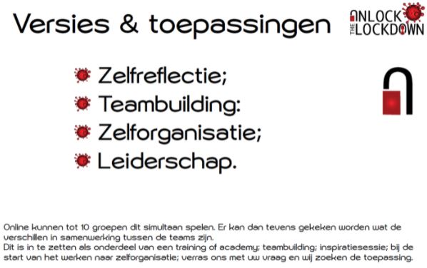 Bij ‘Unlock the Lockdown’ ga je met elkaar aan de slag, om een vaccin te vinden voor het Covid-20 virus. De professor en leider van het onderzoeksteam is op de intensive care terecht gekomen en jullie als teamgenoten moeten het doen met alle info, die hij heeft achtergelaten. De andere deelnemers zitten op afstand (virtueel of in kleine teams in verschillende kamers). De mogelijkheden om puzzels op te lossen zijn niet voor iedereen gelijk. Je hebt elkaar nodig, maar…. niet iedereen zit bij jou in de buurt? Hierbij zal je dus als team optimaal moeten samenwerken, daarbij is de vraag hoe het leiderschap in het team is. Maar 1 iemand kan het leiderschap van de professor overnemen. Wie in de groep is hierin de beste leider en weet zowel leiderschap te tonen als het team goed te laten functioneren qua zelforganisatie?